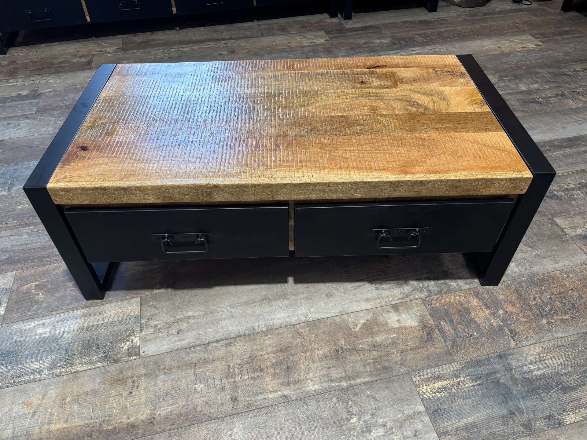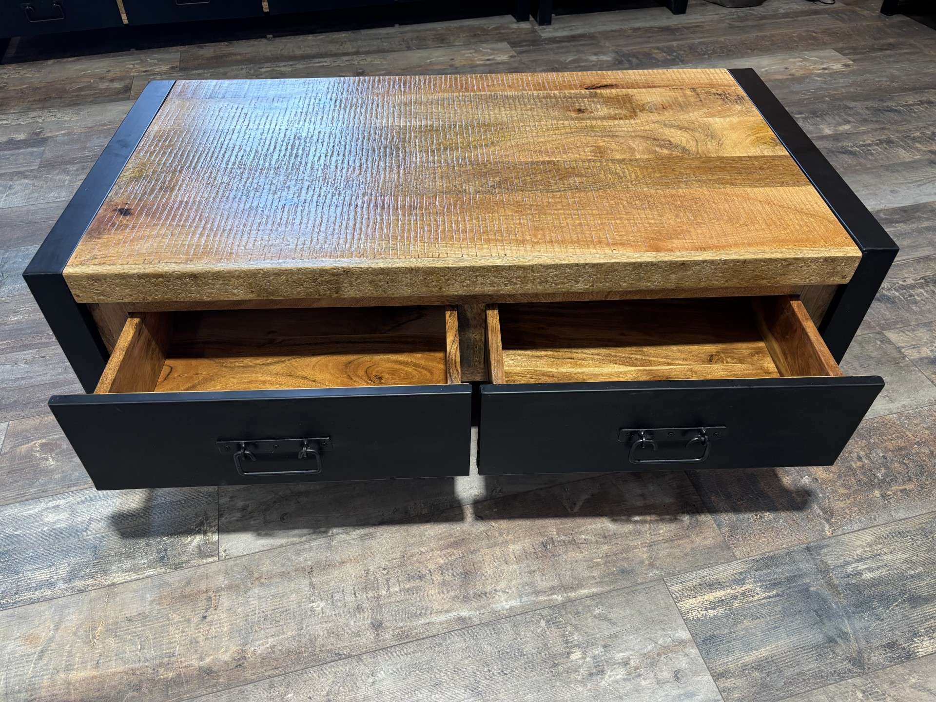 TABLE BASSE 2 TIROIRS MANGUIER MASSIF ET MÉTAL